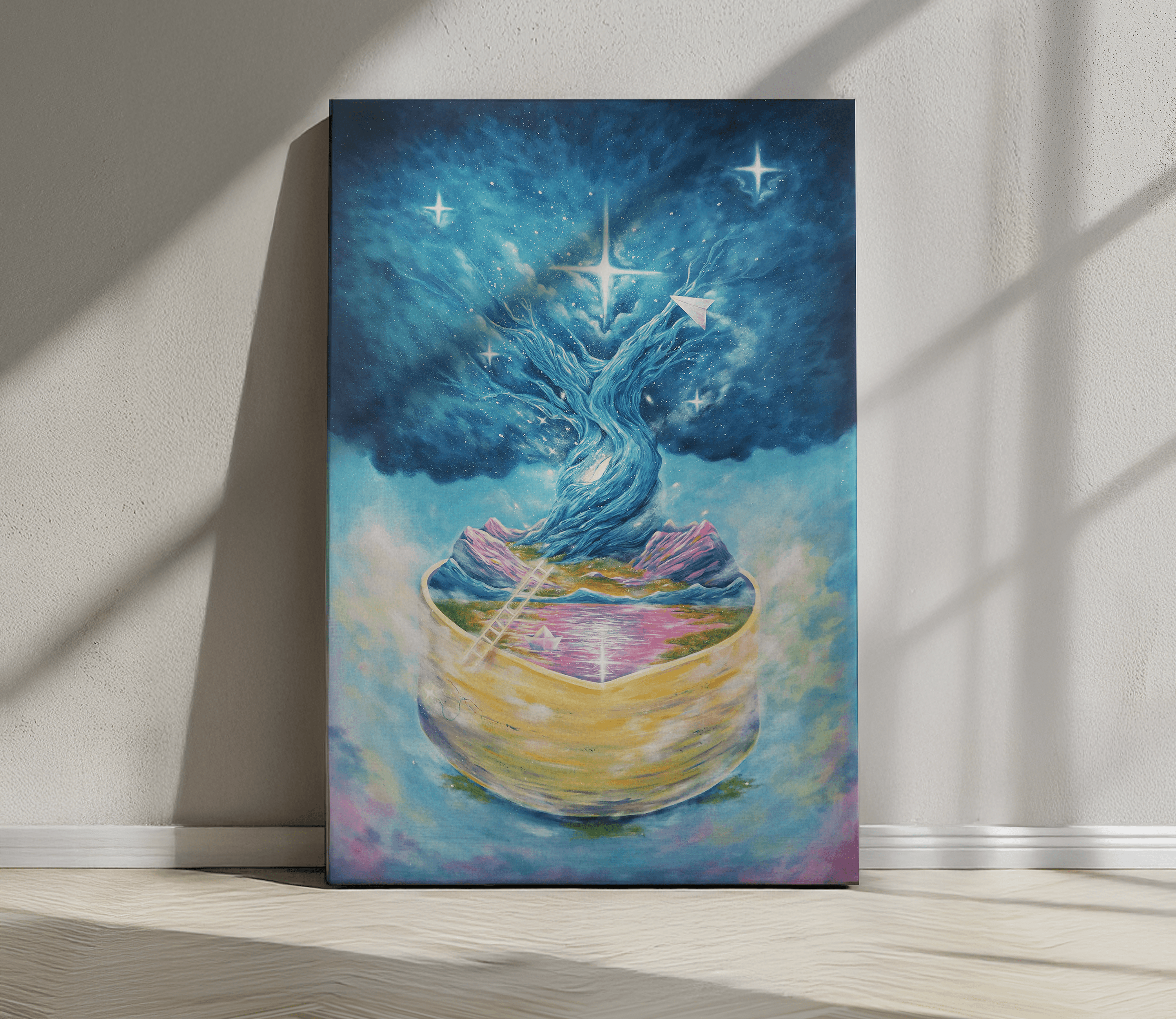My work explores the deep, unseen landscapes of the inner self blending emotion, introspection, and the spirit of childlike wonder. Through surreal and symbolic compositions. Each piece is a dialogue between memory and imagination, inviting viewers into a quiet, reflective space.